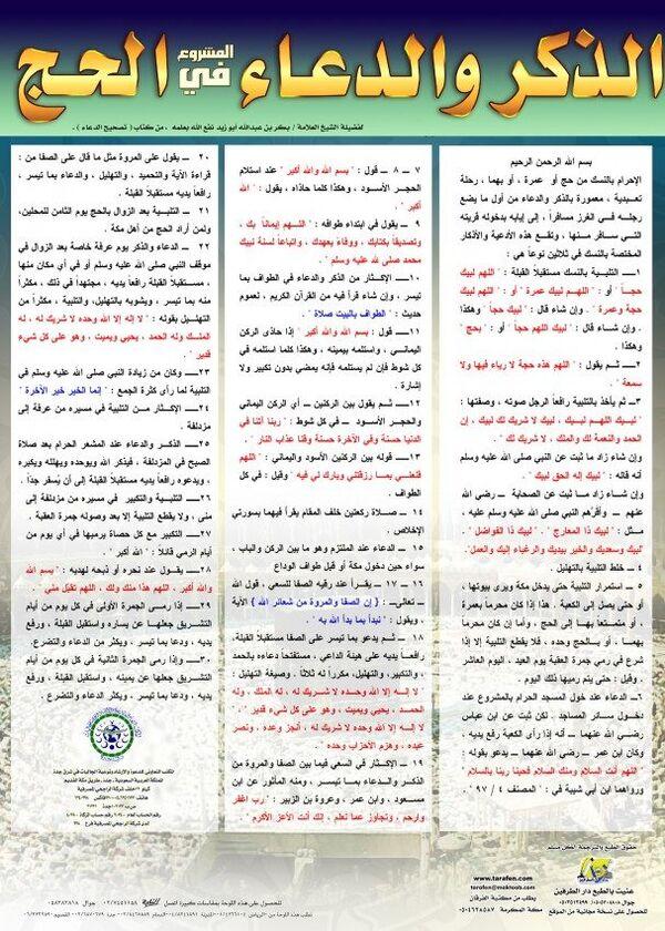 بوستر يحتوي على الأذكار والأدعية المشروعة في الحج، مقتبسة من كتاب تصحيح الدعاء للشيخ بكر أبو زيد - رحمه الله -.