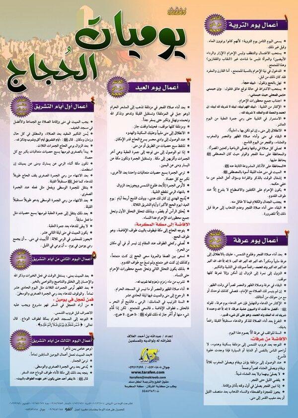 بوستر يحتوي على أعمال الحاج في يوم التروية، عرفة، العيد، أيام التشريق.