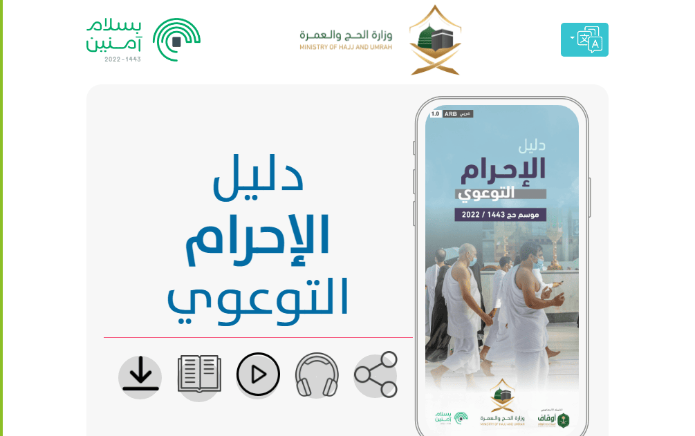 دَليلٌ من وزارة الحج والعمرة السعودية، متوفر بأربع عشرة لغة إضافة إلى اللغة العربية، يتضمن دليل المسجد الحرام التوعوي، ودليل العمرة التوعوي، ودليل المسجد النبوي التوعوي، ودليل خدمات المسجد النبوي، ودليل مكة التوعوي، ودليل معالم المدينة التوعوي، ودليل الإحرام، ودليل منى، ودليل يوم عرفة، ودليل مزدلفة، ودليل يوم النحر، ودليل الجمرات، ودليل التوعية الصحي.